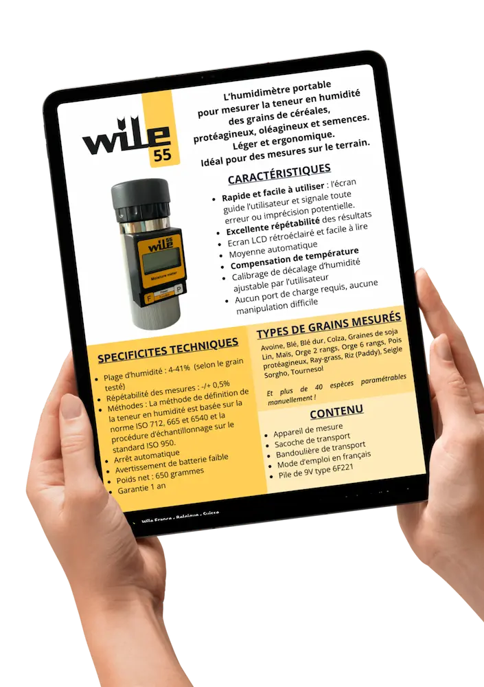 Le Wile 55 vous permet de connaître en quelques secondes la teneur en humidité des grains, céréales, oléagineux, protéagineux et semences.